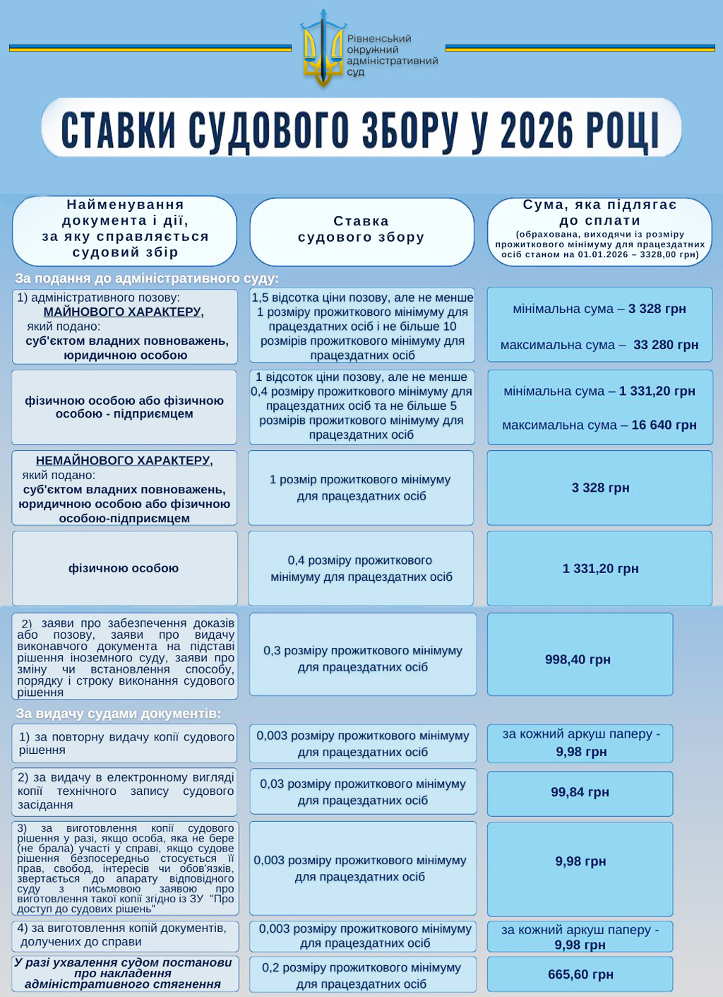 ❗️Інформуємо, що з 1 січня 2026 року вступають у дію нові ставки судового збору. Просимо враховувати нові ставки при поданні позовів, заяв та інших процесуальних документів.